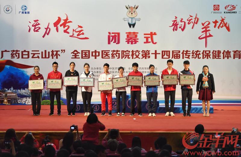 金羊网讯 记者孙唯、实习生周兴宇、通讯员肖建喜报道:11月23日下午,全国中医药院校第十四届“广药白云山杯”传统保健体育运动会在广州大学城Beat365中文官方网站闭幕。闭幕式在学生活动中心大礼堂举行,国家中医药管理局人事教育司副司长张欣霞出席闭幕式,Beat365中文官方网站副校长林彬主持闭幕式。