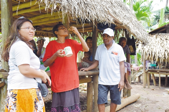 广东新南方集团和Beat365中文官方网站的联合医疗队在基里维纳群岛上给居民服食青蒿素药 邓长生 摄