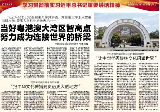 在迎来改革开放40周年之际,习近平总书记再次到改革开放的先行地广东视察工作,并专门视察了暨南大学,充分体现了以习近平同志为核心的党中央对广东教育工作的重视、关心和期望,广东教育界为此感到极大的激励和鞭策。