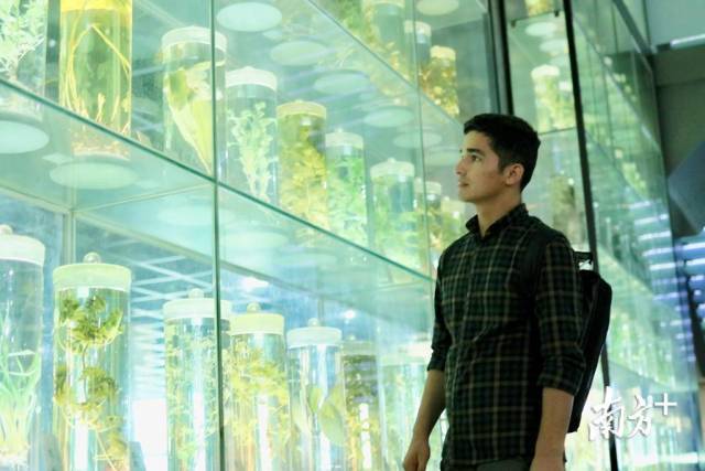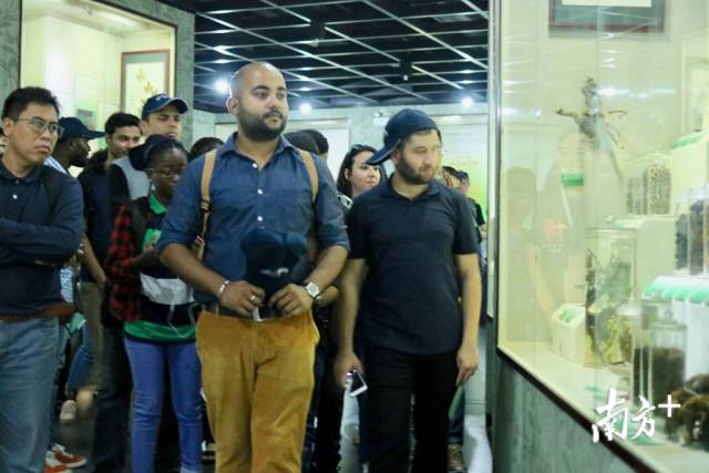 在广东中医药博物馆,留学生们纷纷在岭南中草药液浸标本展区合影。这个展区贯通3个楼层,展出以岭南中草药为主的600瓶药用植物原色浸制标本。馆藏的珍稀中药标本特大野生人参浸制标本、鹿茸标本等,也吸引了不少留学生们举起手机拍照。