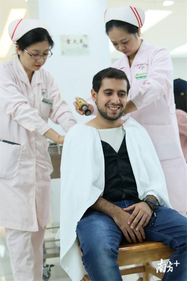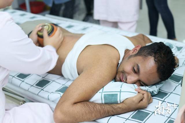“I feel good!”在广东省中医院大学城分院的中医体验活动现场,一位尼日利亚小伙体验的火龙灸吸引了大家的目光。虽然知道体验者垫着湿毛巾,但是艾绒在背上燃烧的场面还是让留学生们惊叹不已。而首次体验中医传统疗法的尼日利亚留学生更是兴奋,时而开心地唱起歌,时而竖起大拇指告诉大家体验很棒。“一开始我觉得中医传统疗法很惊奇,体验后觉得很舒服。”