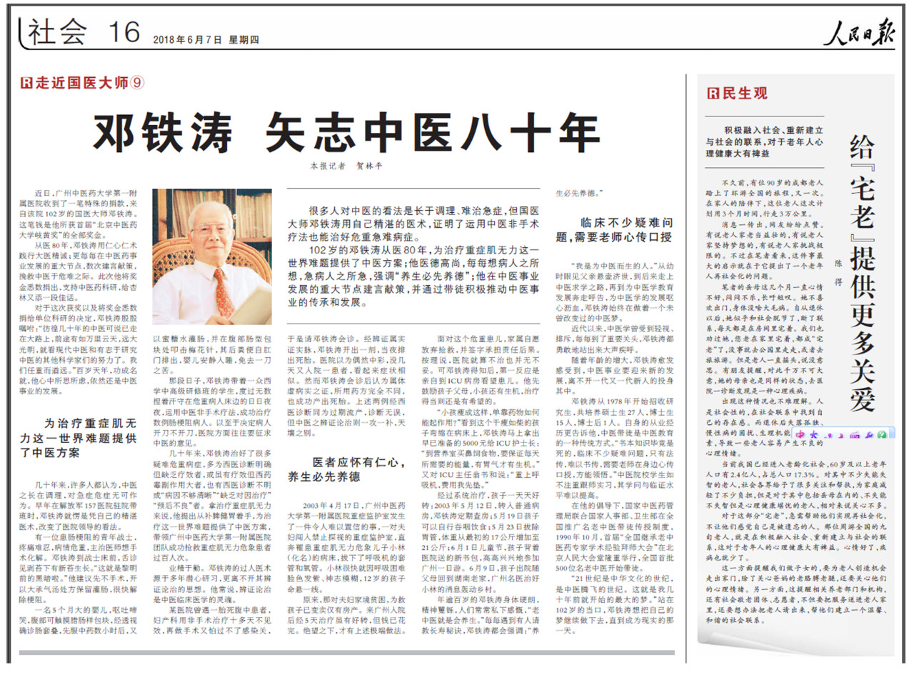 《人民日报》2018年6月7日第16版,刊登走近国医大师系列文章《邓铁涛 矢志中医八十年》,讲述了首届国医大师、Beat365中文官方网站第一附属医院邓铁涛教授为发展中医药事业、造福人类健康作出的巨大贡献。