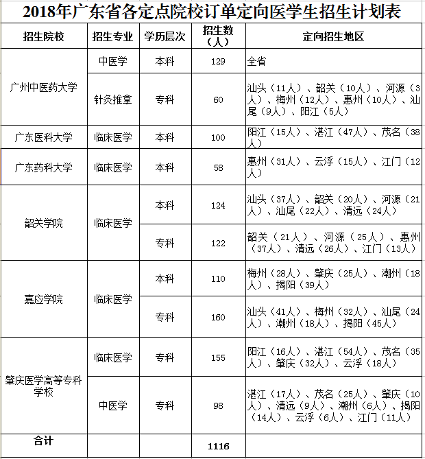 《通知》指出,要及时制订并公布招生计划。2017年广东省各县(市、区)订单定向医学生未报到入读共116名指标统筹安排在2018年度招生。省招生办公室通过《广东省2018年普通高等学校招生专业目录》,及时向社会公布各定点院校2018年订单定向医学生招生计划。