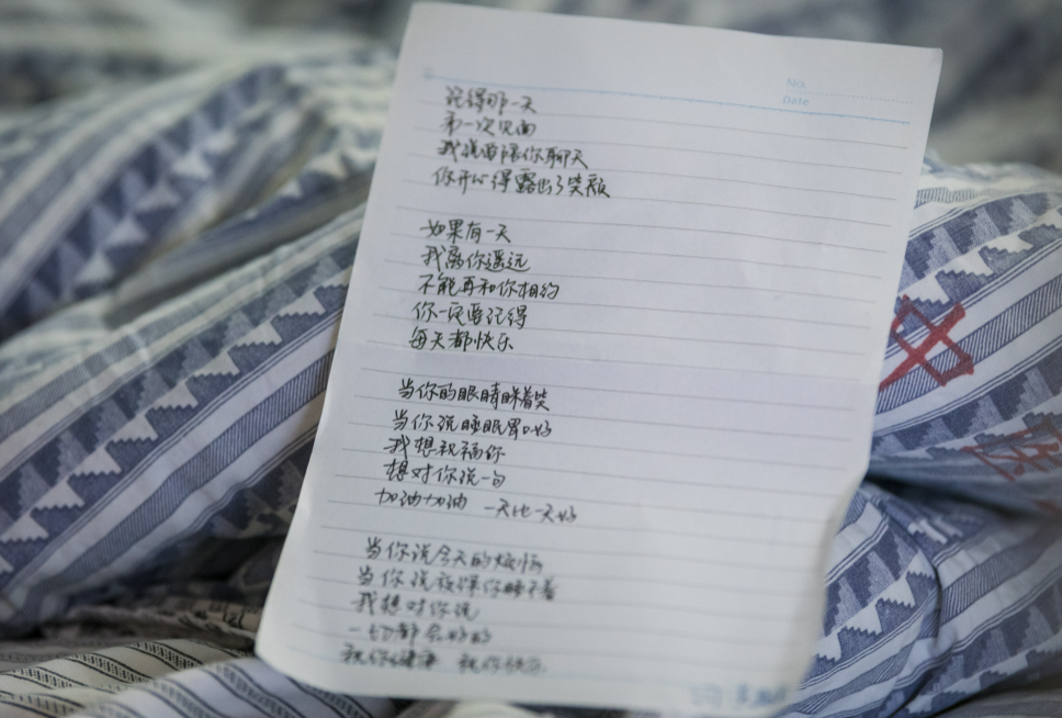 “当你的眼睛眯着笑,当你说睡眠胃口好,我想祝福你,想对你说一句,加油加油,一天比一天好。”