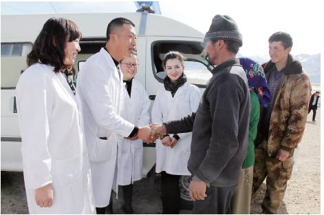 常洪波、程建梅(左二,左一)夫妇上山巡诊。巡诊结束时,一牧场三连职工依明·麦提赛地紧紧握着常洪波的手,向他表示谢意。潘瑞雄 摄