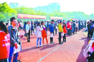 参加招聘会的毕业生正在排队等待面试。