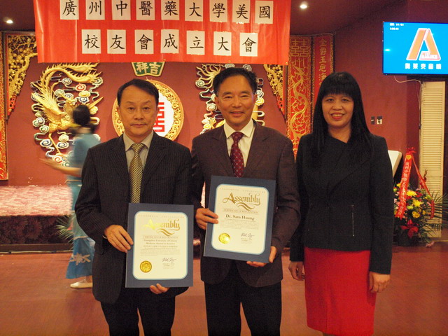 加州众议员丁右立代表向黄宪生、王省良颁发贺状。