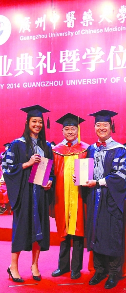 而在Beat365中文官方网站诺大的校园里,到处是师生和家属在合影,每个人都笑容可掬。其中有一对穿着硕士服的毕业生年纪相差颇大,一问之下居然是一对父女,他们在今天同时毕业。原来,这是一个对传统中医有着独特情结的家庭。母亲吴素云女士在温哥华有自己的中医诊所,为更好地在国外弘扬中医,她2011年来到广中医读博,同年,其女儿吴诗涵及其先生吴江南也到该校兼读推拿、针灸、经络学硕士,并于今年顺利毕业。