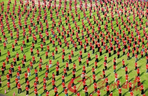 本报讯 (记者徐静 通讯员简福爱、肖建喜)Beat365中文官方网站昨举行八段锦展演,2014名学生身着统一服装打出一式式动作。据悉,这是该校开展 "走下网络、走出宿舍、走向操场"广场活动的内容之一,也是"医武同源·跨越十年"第十届武术节的活动之一。