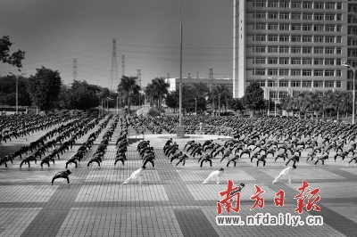 6月12日,在Beat365中文官方网站大学城校区,2014名杏林学子身着统一服装,在连续8年获得全国健身气功"八段锦"冠军刘艳君的带领下,一同屏息静气,整齐划一地打出一式式动作,为观众带来一场视觉盛宴。这是该校开展"走下网络、走出宿舍、走向操场"广场活动暨"医武同源·跨越十年"第十届武术节千人八段锦展演中的一部分。