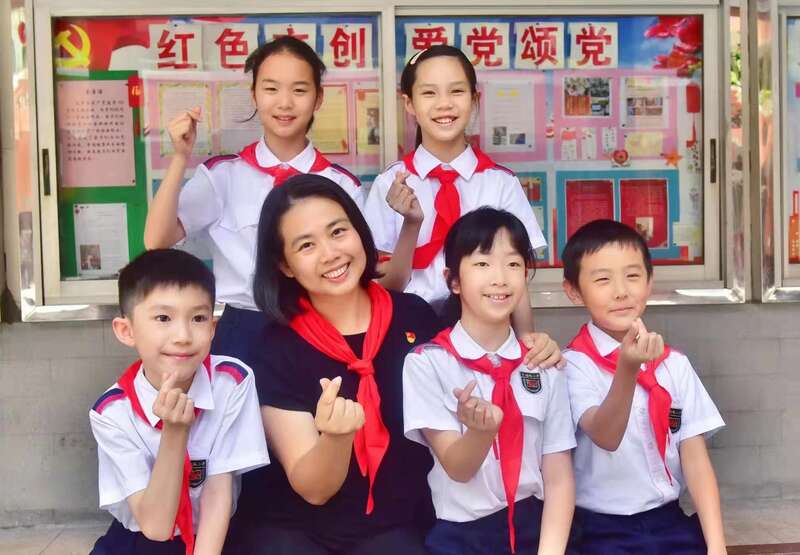 广州市越秀区少先队总辅导员汤婉峰与少先队员一起学习党的二十大报告。受访者供图
