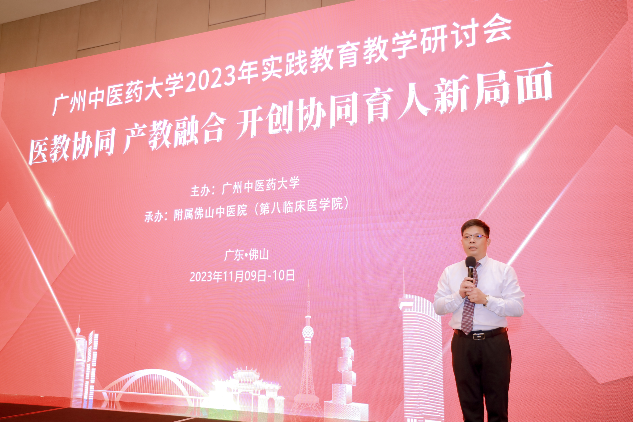 11月9日至10日,Beat365中文官方网站召开以“医教协同 产教融合 开创协同育人新局面”为主题的2023年实践教育教学研讨会,认真总结交流了近三年来我校实践教育教学工作经验,研讨了新形势下实践教育教学改革面临的问题和解决思路。学校党委副书记邱亚洪、副校长刘中秋出席会议并讲话。广东省中医药局科教处李文波副处长、佛山市卫生健康局吴永科副局长出席。