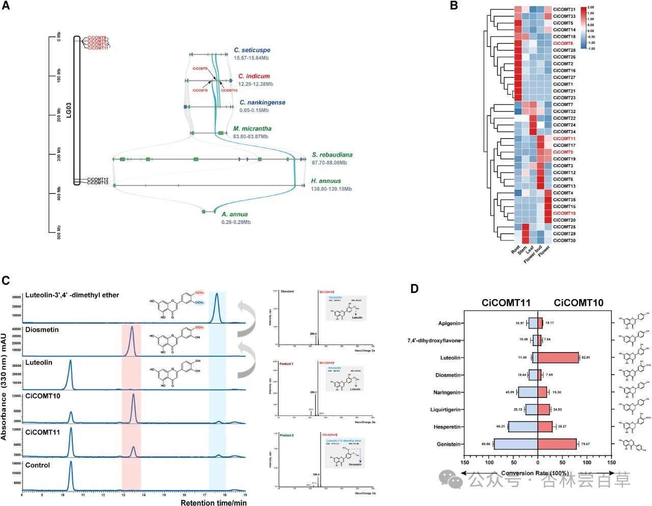 本研究中,作者组装了一个 3.11 Gb 的高质量野菊基因组,重叠群 N50 值为 4.39 Mb,并注释了 50,606 个蛋白编码基因。发现一个串联重复的O-甲基转移酶基因 CiCOMT10 发生了新功能化(Neofunctionalization),特异性催化邻位取代木犀草素(Luteolin)上4'位羟基的甲基化,进而形成地奥司明的重要生物合成前体 Diosmetin。此外,鉴定了糖基转移酶 CiUGT11(UGT88B3)介导 Diosmetin 的7位羟基发生特异性糖基化修饰。最后,作者通过组合CiCOMT10、CiUGT11和之前鉴定的鼠李糖基转移酶(Rhamnosyltransferase),构建了一个一锅级联生物催化系统,从木犀草素出发,实现了地奥司明的高效合成,木犀草素的转化率超过80%。